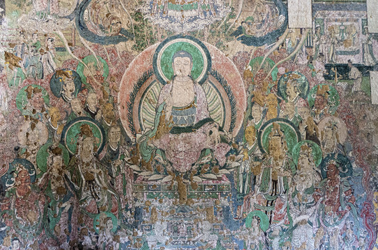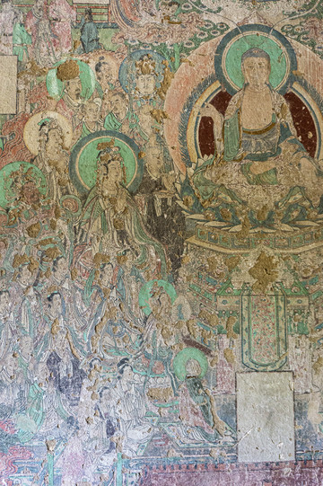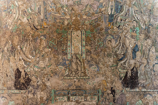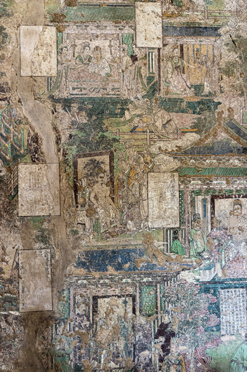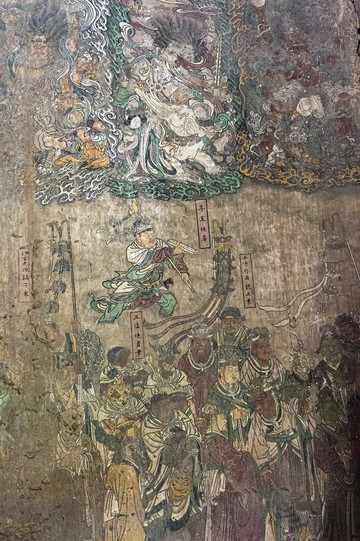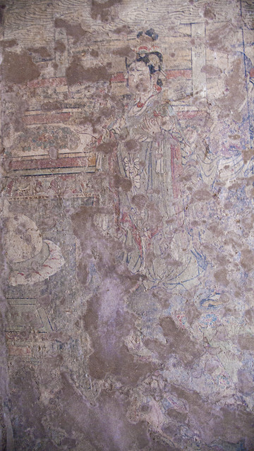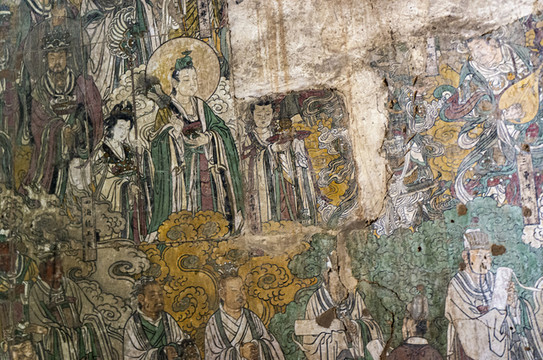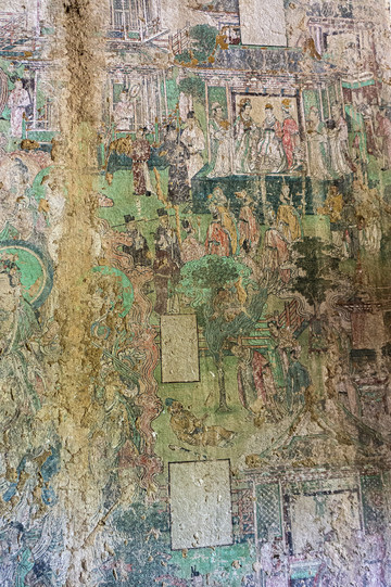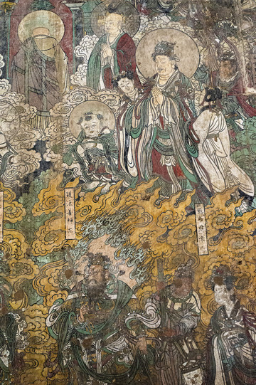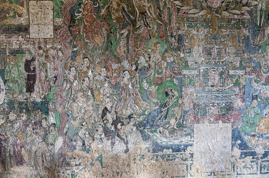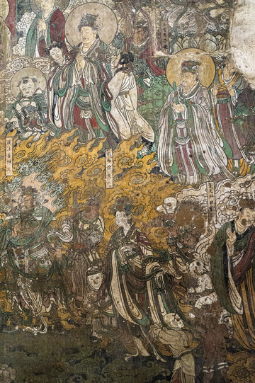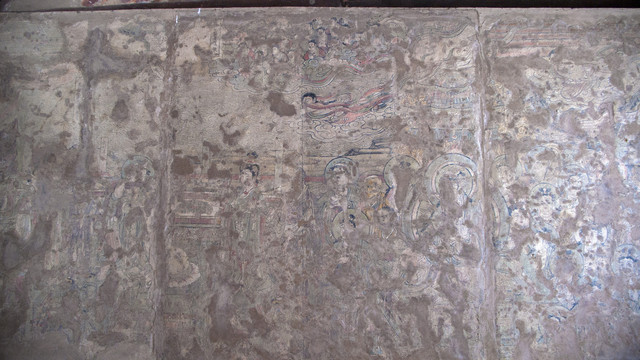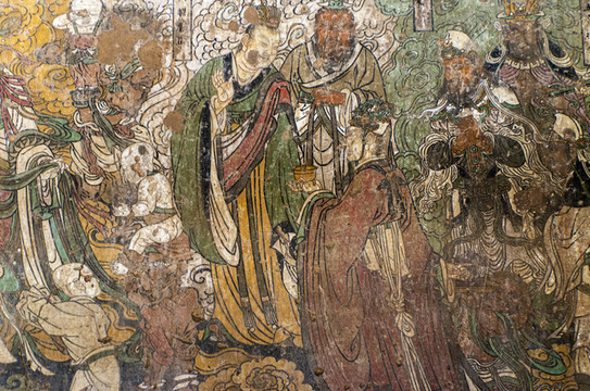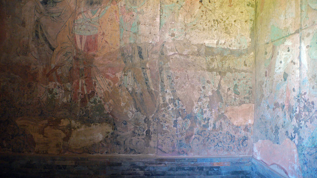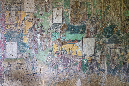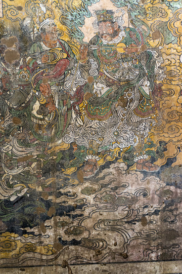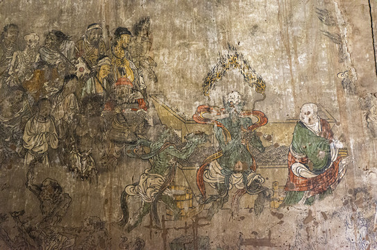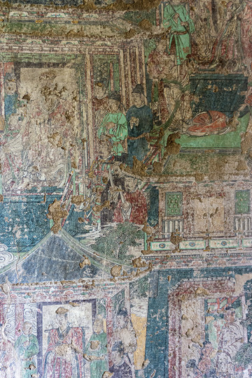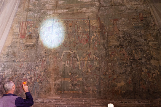 东壁绘维摩诘经变图,尽管因年代久远残损严重,但远观总体布局严谨,画工精细,线描流畅,设色对比协调,实为难得的古代艺术精品,个人觉得就画工来说要胜于同为古代寺观壁画的开化寺,青龙寺,永乐宫,稷益庙等一筹!