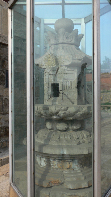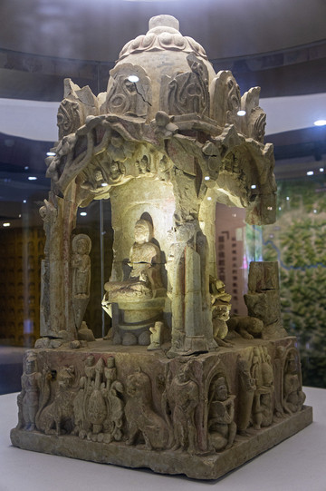 首先大厅里显要位置是埋藏坑里发现的唯一一座北齐白石覆钵塔,硕大的塔身通体彩绘贴金由基座,塔身,覆钵和塔刹四部分组成。四面龛式塔身,各雕凿二身结珈立佛和一身结珈坐菩萨。顶部是古印度风格的整体覆钵,历史和艺术价值极高!