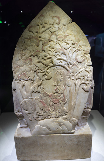 公元6世纪以前,中原北方地区的佛教先后经历了“凉州模式”和“云冈模式”两大发展阶段,邺城地区第一阶段具有明显的云冈时期佛造像风格。5世纪末,北魏孝文帝实行了一系列汉化政策,摹仿南朝造像风格的“褒衣博带”“秀骨清像”式造型成为北方地区佛教造像的主流。6世纪中期,“龙树背龛式”造型在北齐文宣帝高洋时广为流行,成为以邺城为中心的北齐中后期佛像的典型样式。当年的邺城佛造像艺术因政治、文化、社会风俗等因素的影响,呈现出不同的风格变化,以接受、学习古代印度佛教为主,是佛教文化融入中国本土文化的重要阶段。受印度笈多风格影响,邺城地区出现了一种以双菩提树为背屏、北齐新样式佛像为主尊、以镂孔透雕形式表现的白石佛教造像,其造型精美,特征鲜明,与早年流行的尖楣状背屏造像形式迥异,学界称之为“龙树背龛式造像”。据说,无论是透雕技术的广泛运用,还是以整株的菩提树作为背景,都与释迦牟尼为悉达多太子时的树下思惟图像有一定的联系。公元577年,随着北齐灭亡,北周武帝将灭佛运动推广到邺城及北齐境内,之后杨坚又在邺城实行了毁城移民政策,中原北方地区的佛教在此期间遭受沉重打击,寺塔尽毁,僧众流离失所,流传20余年的“龙树背龛式”造像旋即淡出历史舞台。