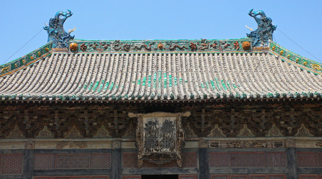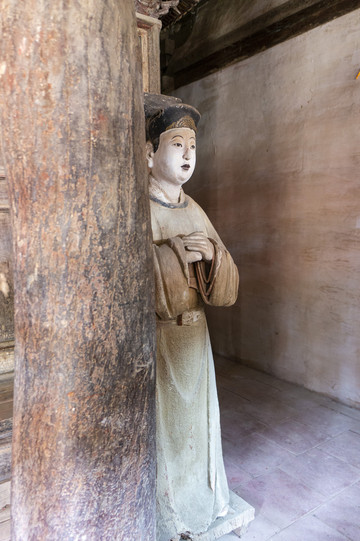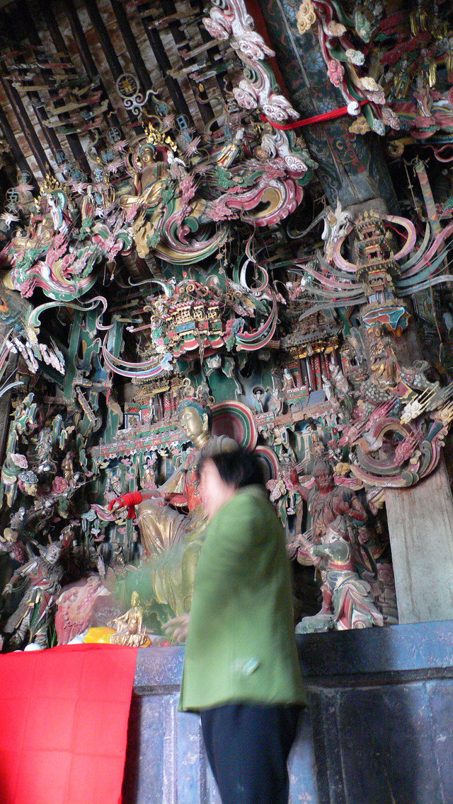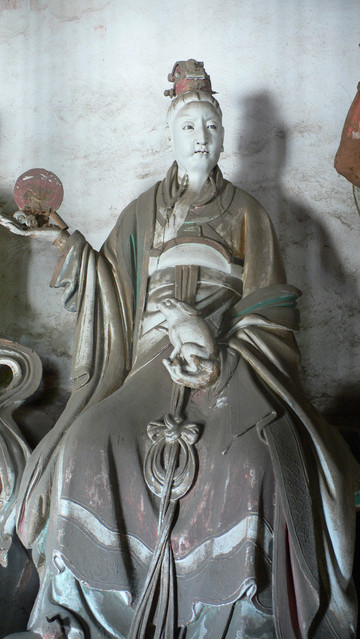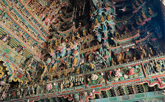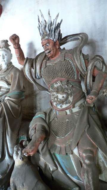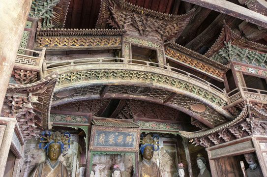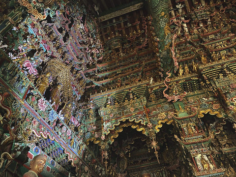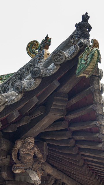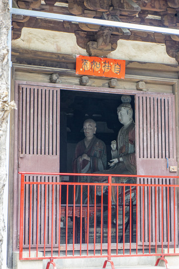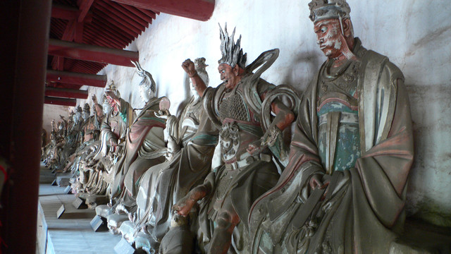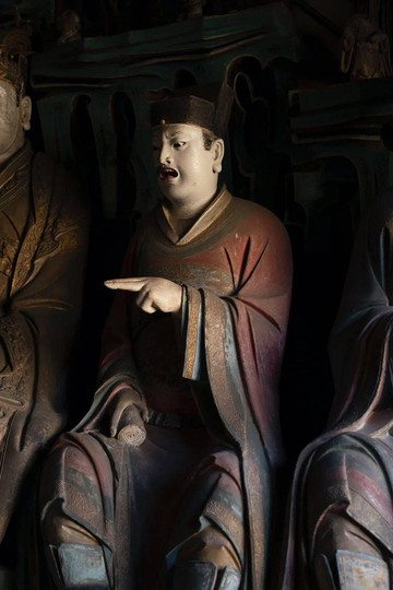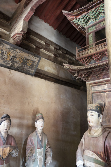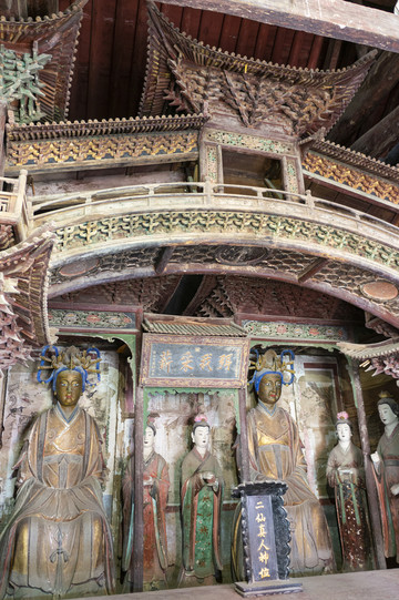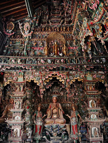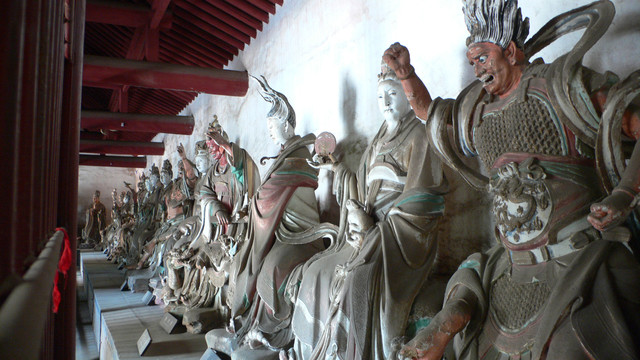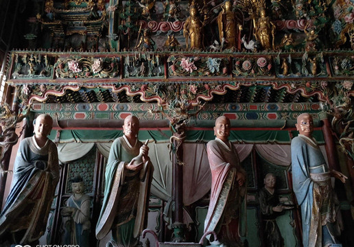 和这次山西之行的起因小西天一样,地处长治北郊的观音堂是明代悬塑的另一个杰出代表,观音殿内的三面墙壁及屋顶梁架之上、门窗顶部,皆是描金彩绘的泥胎彩塑、悬塑。小小的三间殿堂之内,现存约五百尊塑像,彩塑、悬塑相间,儒、释、道三教共融,或坐坛上、或依山墙、或悬椽望。12年前,殿内整个悬塑还是完全开放可以比较近距离的观赏,但现在一进大门就有隔离铁丝网,而且还是密格防飞鸟的那种,对观赏很不友好!