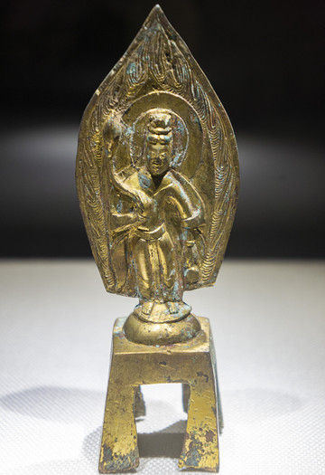 谭副造释迦像,国宝级文物。这件造像面部已残毁,但仍能看出佛像头部残存水涡纹发髻,身穿通肩大衣,右手施无畏印,左手持衣缘,跣足站立于莲花座上。背屏上,还可以看到对称的飞天、火焰纹、力士、供养人等图案。有意思的是,这件文物上的飞天,明显看出肢体稍显僵硬,没有南朝飞天的灵动之感,应该是北方少数民族还没完全按照汉族审美改变飞天的印度风。