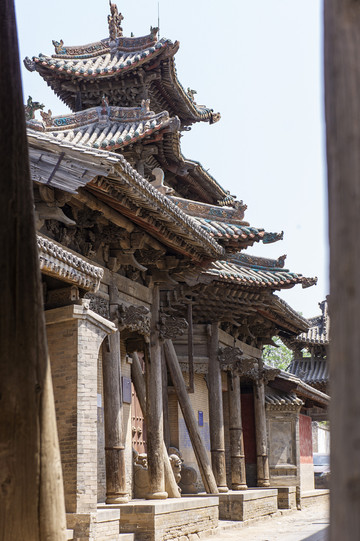 龙门寺(五代至清)在平顺县城西北65千米龙门山腰,此地山峦耸峙,峭壁悬崖,形如龙门,寺建于此,名亦因之。北齐天保年间初创,北宋乾德年间改今名,历代扩建重修。现存中轴线三进院落,东西禅堂、经舍等各成一区,布局严谨。寺内建筑有:山门,金建,三间悬山式,中柱一列,分梁架为前后两段,清秀简洁,中国现存的金代山门并不多见,除了龙门寺外中国应该仅存有高平开化寺(1141)、大同善化寺(1149)、济源关帝庙(1162)、涉县成汤庙(1164)四座金代山门;正殿,宋绍圣五年(公元1098年)建,三间见方,九脊项,斗拱五铺作,单抄单昂,昂嘴批竹式,昂尾压在梁栿之下,前檐小八角石柱上刻有题记,为该殿建造年代之佐证;殿顶琉璃脊兽,形制古老,为元代烧造。西配殿,五代后唐同光三年(公元925年)建,三开间,四架椽,悬山式,柱头卷刹和缓,柱上不设普拍枋,檐下斗拱仅施华拱一跳,栌斗口内设小拱头一枚,简洁古雅,殿内构架於四椽栿上设驼峰、大斗承平梁,两侧设托脚,上置瓜柱和叉手,梁栿外观略呈月梁式,与五台南禅寺相近,朴实而秀美;五代木构建筑悬山式殿宇全国仅此一例。后殿,元建,宽深各三间,六架椽,悬山式,斗拱五铺作,双下昂,虽系明代栿,却沿袭宋、金草栿之规,构件断面不拘一格。东配殿、厢房、廊屋、禅院等皆明、清重建.外形庄重,雕刻细腻,门窗装修较前华丽。集六个朝代(五代、宋、金、元、明、清)的建筑于一座寺庙之内,这在中国现存庙宇建筑中极为罕见。