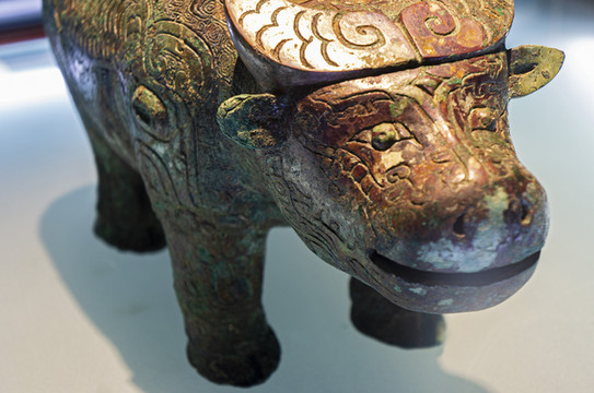 亚长牛尊于2001年出土于安阳市殷墟花园庄一所墓葬。这座墓葬保存完好,该牛面部铸铭文“亚长”是商王朝南部“长”国的部落首领,是地位仅次于妇好的军事将领,也是这座墓葬的主人。是殷墟少有的未被盗掘的商代墓葬。此尊整体作牛形,通长40cm,带盖高22.5cm,腰围52.5cm,注口长12.9cm、宽9.1cm,重7.1kg。牛体态健壮,牛头前伸,口部微张,其眼、耳、鼻、角、腹、尾以及其他体貌特征均生动逼真。牛身满饰龙、鸟、虎、象等各种动物形纹饰。造型奇特瑰丽,纹饰繁缛精美。