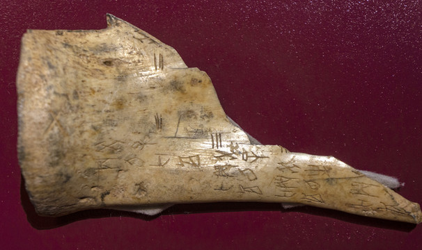 甲骨文是一种成熟的方块字,因刻在龟甲、兽骨上而得名。殷墟已出土刻辞甲骨约15万片。记有5000余单字,卜辞10余万条。内容涉及政治、经济、文化、天文、气象等各方面。殷墟博物馆甲骨厅陈列的甲骨近100片,其中90%以上刻有卜辞。甲骨文内容庞杂。但其基本内容包括有祭祀、征伐、田猎、天象等类。文字厅中的“甲骨文内容分类解读”提供了甲骨文原文、隶定、中文解读、英文翻译,可供参观者细心咀嚼。例如当年罗振玉收藏的甲骨中,有一片记录着商王朝与西北强族的关系。这片甲骨显示:在不足30天的时间内,分别有名叫长友角、妻竹、止嘎的3个人报告了4次西北工方、土方入侵的报告。强敌入侵还引发当地百姓逃亡。- 摘自博物馆巡礼
