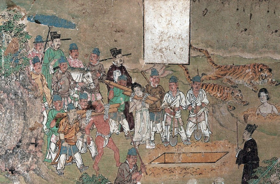 白马吻足是佛传故事中具有典型性意义的重要片段之一,最早出现在东吴支谦所译的《太子瑞应本起经》中。释迦太子(释迦牟尼佛祖)出城目睹了人世间生老病死的苦难后,发誓要寻找帮助人们摆脱尘世苦难的出路,在天帝释的帮助下,冲破宫廷束缚,驾骑爱马“犍陟”逾城来到苦行林中,在寂静的大自然环境中,心生顿感悦愉欢喜,下马思惟,回想到桩桩人世间不堪回首的烦恼,下定决心离开仆人爱马,吩咐仆人与白马返回宫中,单独寻求解脱之路。此时,白马“犍陟既闻被遣,屈膝舐足泪落如雨”,白马听闻太子欲将其遣返回宫,当即屈膝跪地亲吻佛足,依依惜别不忍离去,太子看见白马如此的悲痛,不觉也落下几滴眼泪,他即刻用柔软的手抚摸着白马说道:“犍陟!请你不要悲伤,我非常感谢你,到现在,你已为我竭尽良马的劳苦,已为我服务终了。犍陟!你从此将会免除恶道轮回,将来你必定有好的果报。”