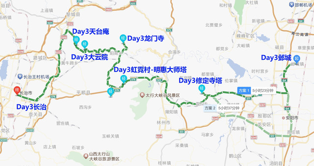 A.外部交通-从河南邺城镇去修定寺塔和平顺霓虹村路况很好,基本按导航就可以了,进入山西太行山景色还是不错的。霓虹村去龙门寺建议选择走路程少的省道,除了开始有一小段在修隧道是砂石路外,余下的都是路况良好的柏油路,其中基本是沿山西的太行一号彩标旅游公路行驶可谓风景如画,就是开始的那段砂石路那也是值得留念的挂壁公路。快到龙门寺必经的324省道可能会堵车的话,进入的岔道口侯壁村边沿浊漳河南岸的小路是可以完美避开堵车路段的。龙门寺去其他景点和长治直接跟导航就好了,只是去大云院会穿过一个村庄在里面有可能会开错路口,建议注意问下。