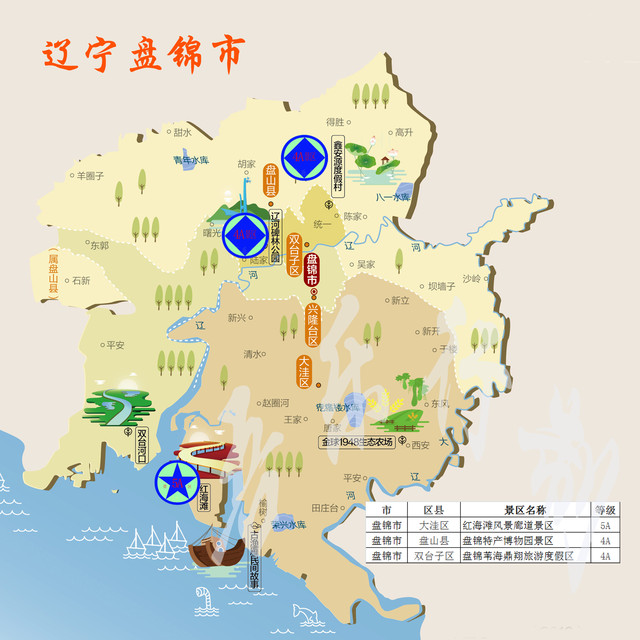 交通信息:可以通过盘锦旅行社的景区直通车从盘锦市抵达景区。自驾用时:1小时9分钟,里程:47.4公里。