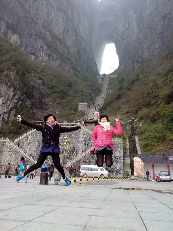 下午我们就到张家界了。一下车,首先要下一个很陡的阶梯才能到达停车场。下阶梯时,会有很多人向你推介几日游,此时你就别表示相关兴趣,一旦你有意问几个问题,你就会被热情的婆婆妈妈野马们所包围,所以此时的你应该直奔出站口左侧的大广场。最好是在家没出门之前先在网上把你们选好的导游联系好,让导游在车站接站,是最安全的,这样你们就少了很多麻烦。我们这次出门也是在网上看的别人写得攻略,很受欢迎的陈晨导游,一开始,我们对他很不放心,毕竟是看别人游记找到他的,担心被坑,但是见面后,很快让我们放下了戒心,人超级好,后来我们也对自己联系上陈晨当导游感到十分的庆幸,她在当地关系还算不错,也会及时提醒我们那些东西可以买,那些东西不能买,基本上她不会带我们去购物,整个行程在张家界呆了三天两夜,我们交给了陈晨850块钱,包括食宿,以及张家界森林公园门票248还有天门山门票261。如果没有导游,在张家界肯定被坑的很惨,那里的商家很黑,对游客的态度很不好哦,不会给游客指正确的道路的,而且物价超级贵,一个蛋汤都要几十块钱。反正,如果要去张家界而且是第一次去的话,强烈建议联系导游,防止在山上迷路和被坑!我们的导游陈晨很不错,推荐给要去的朋友。