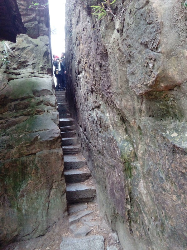 早上九点半我们从丁香榕坐环保车到了杨家界景区,为了去看天波府。乌龙寨以前是土匪窝,据说当时土匪都赶不下来,后来是招降的。到天波府的路有一段特别难走,需要弯下腰低下头,正是所谓的"人在石下走,不得不低头"。有蛮大一段路是只能一个人上下的,我们当时说,胖子是走不过的。而这还不是难点,最艰难的部分莫过于我们爬上天波府的那一段。是笔笔直的楼梯,没有保险带,要扶着旁边的铁栏杆爬上去,不远处就是悬崖。上去之后,那才是真正的美景,就一小块平台,可是却让人领略了张家界的壮丽秀美。等到要下去的时候,小妞犯难了,腿抖啊!