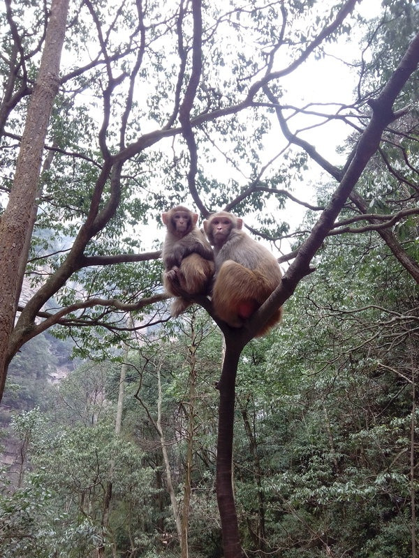 照片描述:蹲在树上放哨的猴子,拍摄地点:张家界金鞭溪
