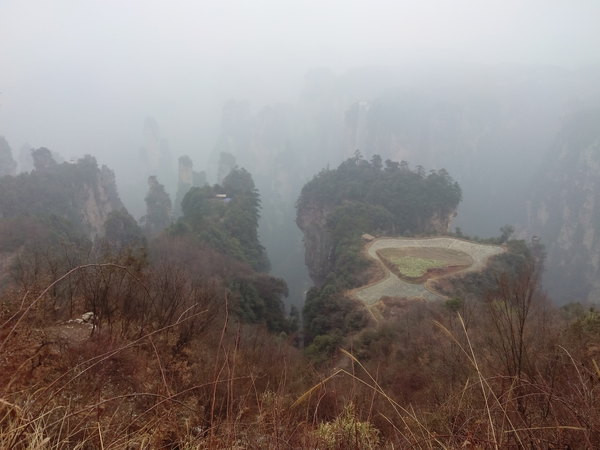大约过去半个小时之后,站在山上,可以看到对面的百龙电梯,下面就是著名的空中田园。有两个空中田园,小的那个比较好看,两个都是梯田,小的那个种的是水稻,形状比较好看。往前走,下山之后就有一个平台,那里就是神兵聚会了。站在那个平台上就可以一览张家界的奇山怪石,美不胜收。可是那一段下山的路有点难走,都是没有护栏的,路也没有修好,就和山里村民走出来的村道差不多,走的时候千万要注意,别滑下去。走下山到平台大约需要20分钟,为了美景,这段路的艰难也是值得的!!
