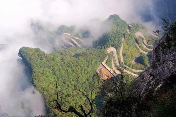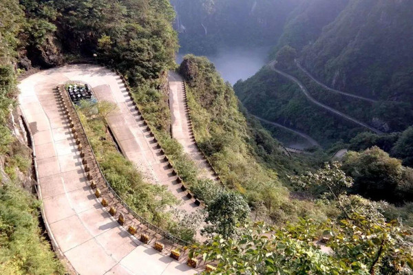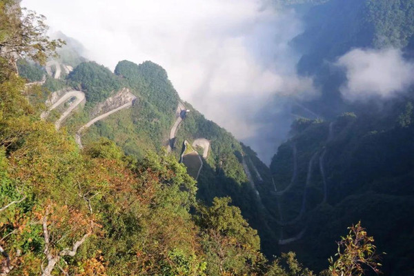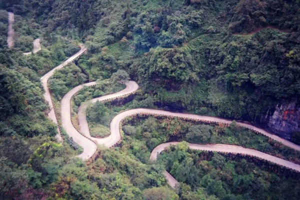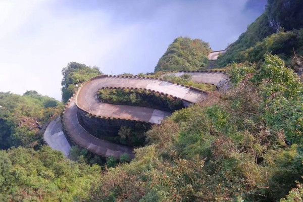 乘大巴所走的是通天大道,又叫“九曲天路”,此路总长不过10公里,却暗藏99处惊险急弯,海拔从200米迅速提升至1300米,此消彼长的急弯之间峻急陡升,犹如一条盘卧在山间丛林的巨蟒。