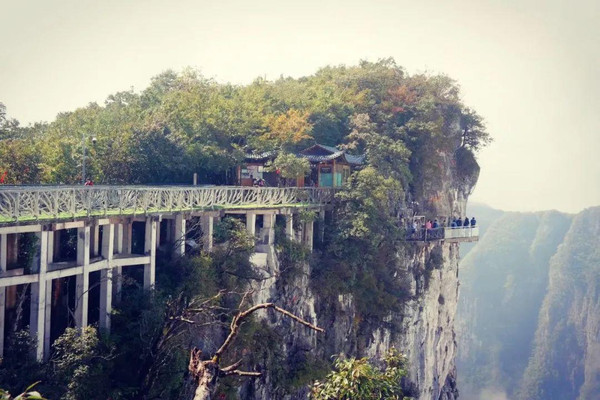 传说中凌霄台是神仙下到天门山的第一站,此处孤悬于万仞绝壁顶端,视野辽阔,晴好时可俯瞰张家界城区全貌,有时则可看到云海翻腾,山峦叠嶂,凌霄畅远,令人胸襟大开。