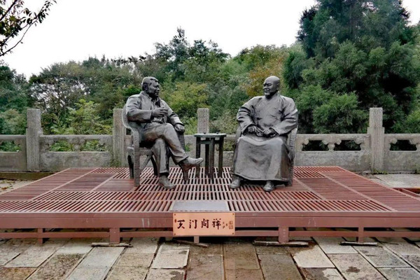 寺外有一组“天门问禅”雕塑,塑造了著名书法家贺晶沙先生向天门山寺方丈怀梵禅师问禅的场景。