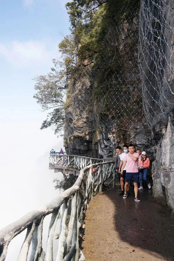 凌霄台外侧的绝壁上有一段高空栈道,倚悬崖,靠云海,又险又美。