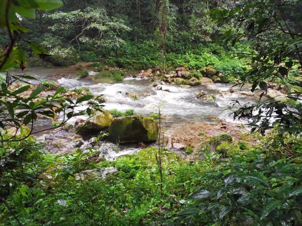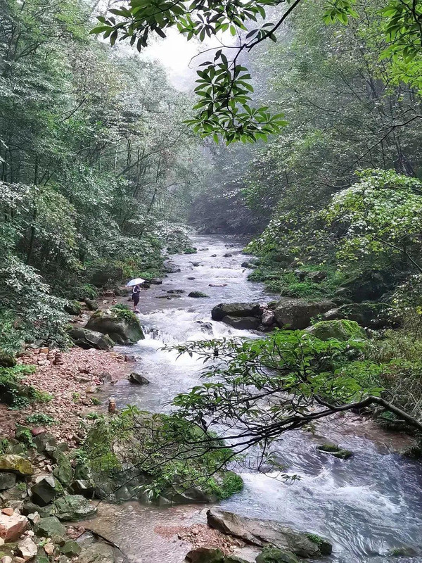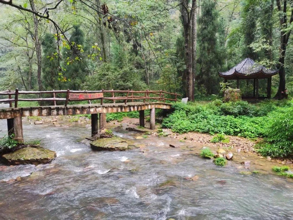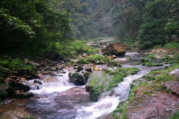 金鞭溪发源于土地垭,终止于水绕四门(上文提到西汉张良的埋葬地),全长7.5公里,几乎横贯整个森林公园。它穿行在深壑幽谷之中,蜿蜒于林海苍翠之间,溪水清澈,鸟语花香,岩峰千姿,构成了一幅优美的山水画卷。