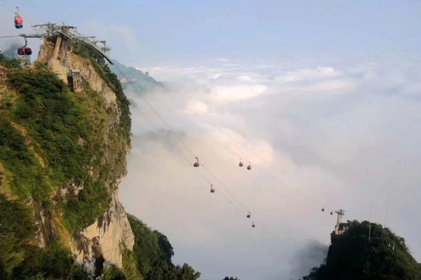 天门山索道全长7455米,高差近1.3公里,可一步登顶,遍览从山脚到山巅的不同风景。
