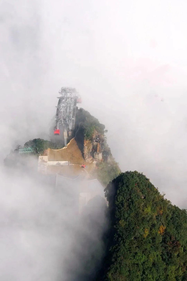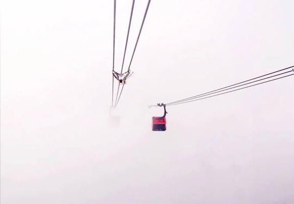 大部分游客会乘坐天门洞快线索道先到达天门洞,之后乘坐穿山自动扶梯上山顶。缆车行至半山腰时,云海包围了整个视野,周遭一切都不可见。