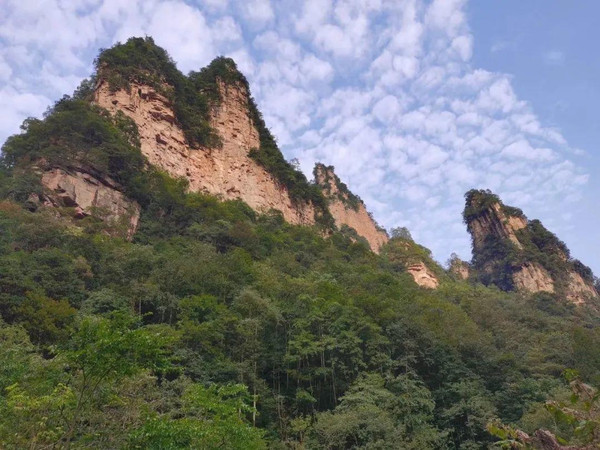 天子山脚下是十里画廊——一条长达5.8公里的狭长峡谷,峡谷两侧群峰高耸,造型百变,如一尊尊天然雕塑,走进峡谷如漫步画廊。