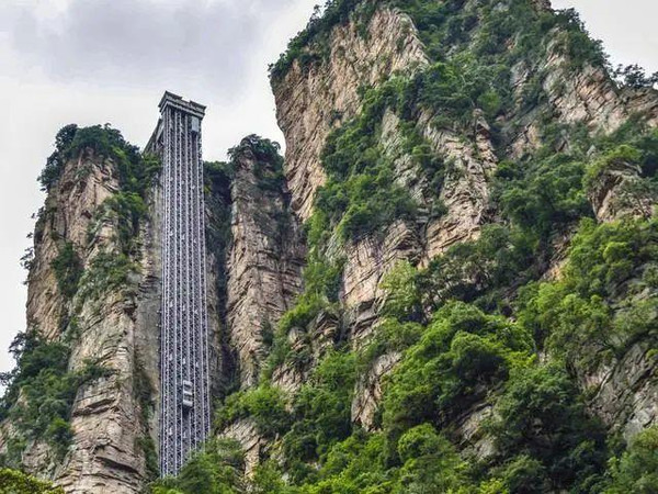 在森林公园内登上袁家界有两种方式,一种是乘坐劈山而建的百龙天梯,这座电梯高达326米,荣获“最高室外电梯”的世界吉尼斯纪录,本身也是袁家界一景。