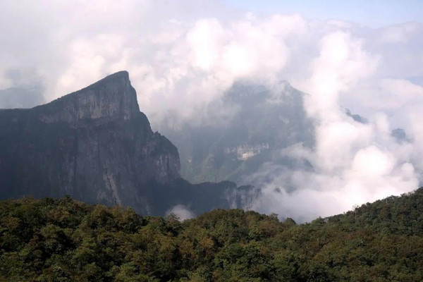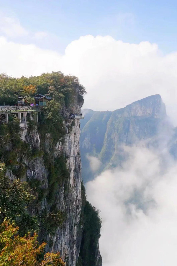 从珙桐园一路北上来到了云梦仙顶,这是天门山的最高峰,海拔1518.6米。传说中天门山是介于仙凡两界的神山,云梦仙顶就是离仙界最近的地方。这里有一座观景阁,登阁视野开阔,晨观日出红山,夕观日落熔金,晴朗时可远眺武陵源奇峰,可俯瞰澧水河如玉带蜿蜒穿过张家界城区。