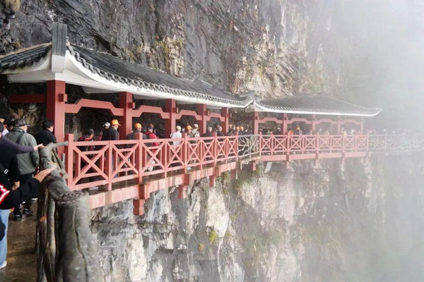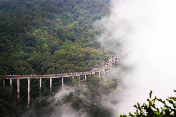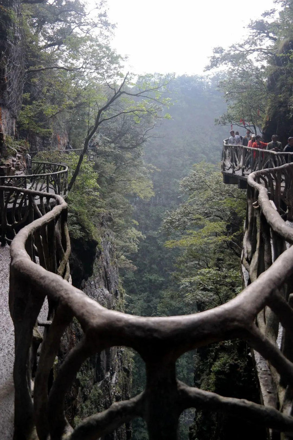 玻璃栈道之后是鬼谷栈道,全长1.6公里,因修建在鬼谷洞上方的山体上而得名。栈道凌空悬挂在峭壁之上,一路绝壁天堑如斧劈刀斩,脚下峰峦起伏,幽深莫测,沿线云海翻腾,恍若仙境,美不胜收。