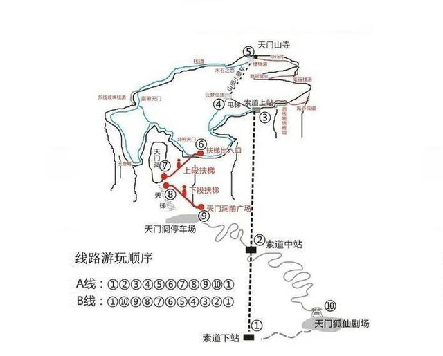 经典游玩路线(仅供参考):张家界市区索道站入口,大索道上山→游览山顶景点→玻璃栈道→穿山扶梯(下行)→天门洞→通天大道(999层台阶)→快线索道下山→后山停车场→景区游览车→市区索道站(停车场)