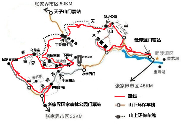 第1天:武陵源核心景区门票站进→坐杨家界索道上→游玩杨家界和袁家界→再游玩天子山风景区→乘坐天子山索道下→晚宿武陵源镇上(和张家界市区一样繁华);