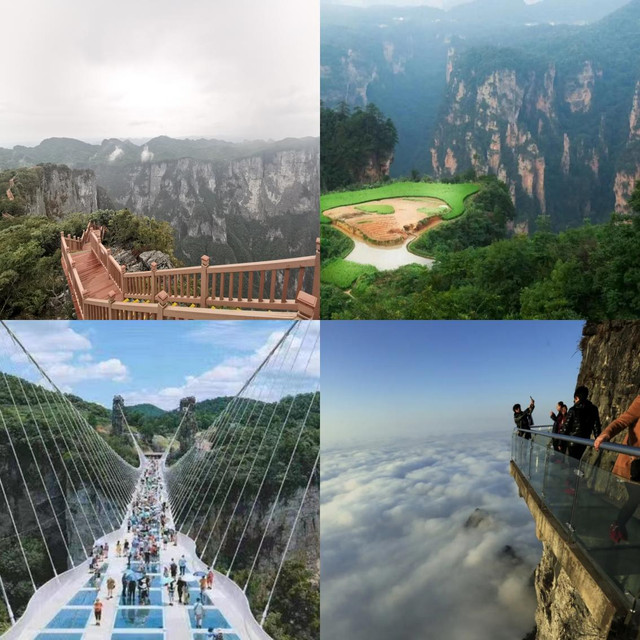 (从左到右依次为:七星山、武陵源核心景区、玻璃桥、天门山)