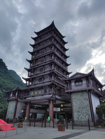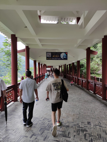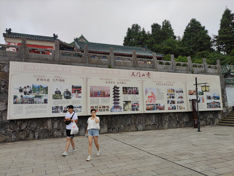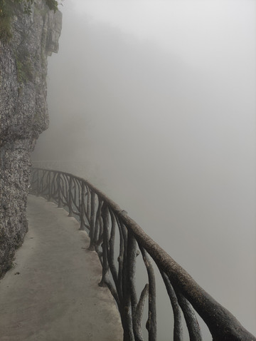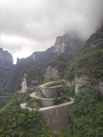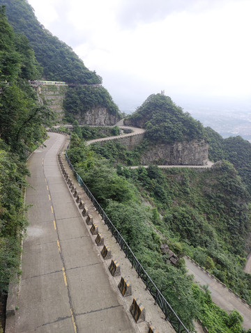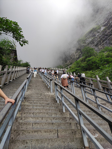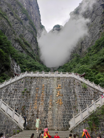 天门山寺始建于明朝,是湘西地区的佛教中心,自建寺以来信士众多,香火鼎盛。天门山寺我向大家介绍的是最后一重大殿里面供奉着佛祖真身舍利子(2009年06月08号下午,修葺一新的湖南张家界天门山寺,庄重嘹亮的号声响彻山间,法乐回荡四方,中国佛教界首次组团前往佛教创始人释迦牟尼故乡——尼泊尔蓝毗尼迎请的舍利,正式安放此间)。天门山寺入口有去云梦仙顶森林缆车的搭乘站,绕过森林缆车,直走就是东线(全长3.7公里),景点有珙桐园,东线玻璃栈道,南俯视天门洞,樱桃湾等。在珙桐园的三岔口,本来想到鲲鹏顶看看,但当时雾大雨大临时封闭了(雨大没有看到,工作人员说的,但雾真的是很大),走到穿山扶梯上站(天门山穿山电梯,全程在山体隧道中运行,从天门洞广场直达山顶,共12段,运行长度为897米,提升高度340米,总跨度为692米),其中从天门洞广场到天门洞口是下段,即替代999级天梯,是收费的,单程32元/人,从天门洞口到山顶是上段,此段只有这一条路,所以免费。乘坐穿山扶梯下到天门洞,天门洞是世界上海拔最高的天然穿山溶洞,位于海拔1260多米的绝壁之上,门洞高131.5m,宽50余米,终年云蒸霞蔚,历来有“天门吐雾”、“天门灵光”、“梅花飘雨”三大奇景。当日据说是天门吐雾奇景,但对于我来说是想一睹天门洞真容的。留有遗憾下次吧。然后走下999天梯,天梯非常陡,上行腿累,下行心累。站在天梯顶上向下看,感觉比较吓人,其实走天梯很安全,两边有扶手,建议走天梯,体验一下,而且在天梯上看天门洞是另外一种感觉,
