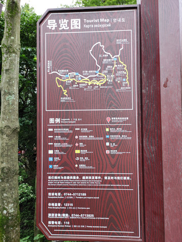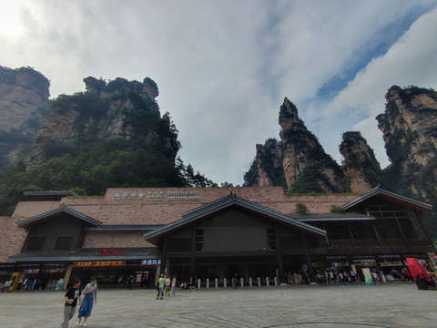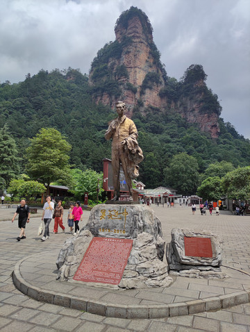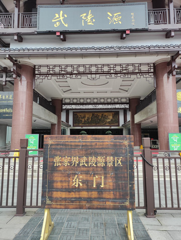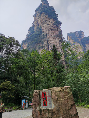 办理入住,准备到前往黄石寨,在门口遇到酒店礼宾部员工,热心送上张家界国家森林公园景区地图,建议我放弃到黄石寨的想法,拿出手机让我看张家界一机游小程序(可以实时查看森林公园各个景区的视频),一看才知道,上山所有景点都是大雾弥漫,而且还在下雨,礼宾部员工建议我到金鞭溪或者十里画廊,有雨有雾不怕,不影响游玩。听从建议,出酒店步行大概10分钟到达张家界国家森林公园东门(索溪峪标志门,之前叫武陵源门票站、武陵源吴家峪门票站),张家界国家森林公园很大,由张家界国家森林公园,天子山自然保护区,索溪峪自然保护区和杨家界自然保护区四个部分构成,一共有五个门票站,东门(索溪峪标志门),南门(森林公园门票站),东南门(梓木岗门票站),西门(杨家界门票站),北门(天子山门票站)。这几日我都是从东门(索溪峪标志门,门口有高高的塔楼,官网介绍标志门是武陵源的一个地标性建筑,是武陵源城区一道亮丽的风景。以庭院深深几许,转角飞檐檐九重为创意,集世界自然遗产和土家建筑文化(小青瓦、坡屋面、外挑檐、转角楼、浅灰墙)于一体,耗资2500万元,建筑面积5045平方米,其中主体建筑物共9层,高39.9米,宛如一个小巨人屹立在武陵源城区)进出,一次从南门进(森林公园门票站,门口有吴冠中当代著名画家、美术教育家的铜像,张家界就是凭借着他写的游记散文《养在深闺人未识——一颗失落的风景明珠》一步步走出深闺,走向世界)。在网络上购票,张家界国家森林公园大门票(含景区内环保车,不包括索道、电梯等交通工具),森林公园因为很大,分山上和山下景区,山上景区有两部分,一部分天子山、杨家界、袁家界是相连的,可以乘坐山上景区车到达,另外一部分是黄石寨,是一个单独的山。山下景区金鞭溪和十里画廊。在网上购买没有入园时间的限制,随时购买,随时入园,大门票可以从5个门票站东门(索溪峪标志门),南门(森林公园票站),东南门(梓木岗门票站),西门(杨家界门票站),北门(天子山门票站)进入。大门票4天有效,不需要取票,直接刷身份证进入。