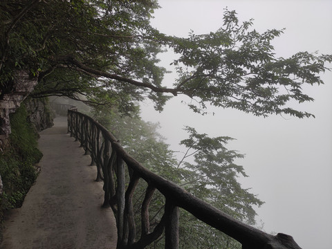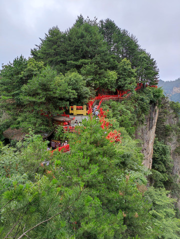 上云梦仙顶,还有两种方式:一是在天门寺坐森林缆车上去,单程38元,二是在珙桐园旁边岔道走上去,据说是景色一般,徒步时间不长,回程可以选择直梯或者森林缆车。到云梦仙顶如果购买的是A线票,个人建议还是直接电梯上下,然后再走一个西线东线的环线,这样线路也好安排,也不用花钱。而且走大环线时不会走冤枉路,因为走西线---东线大环线时,还没走到索道上站的地方就要坐穿山扶梯下天门洞了。按照路标指示向凌霄台方向开始我的西线—东线的山顶大环线。西线(全长2.7公里)景点有凌霄台,西线玻璃栈道,鬼谷栈道,悬索桥,鬼谷洞到达天门山寺,