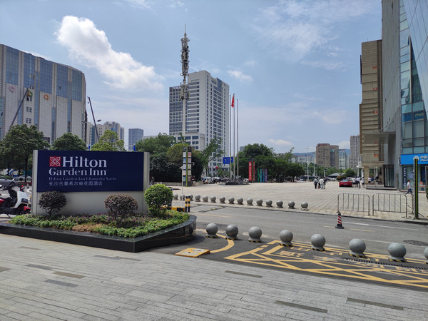 在长沙南高铁站,乘坐长沙地铁2号线到人民广场东,换乘6号线到白鸽咀站,出4号口步行3分钟到长沙岳麓希尔顿酒店,酒店虽然远离五一广场等步行街,但紧邻王府井商业街,负一层有茶颜悦色,河马超市,五层各种美食店,吃饭购物方便。旁边是长沙地铁6号线白鸽咀站,6号线直达机场,到长沙南,五一广场,橘子洲,岳麓山需要换乘一次,总体来说出行方便。酒店很新(携程标住是2022年),设备设施新,齐全,智能电动窗帘及灯控,卫生间,淋浴,洗手台分离,而且空间很大。房间干净,卫生无死角,早餐在一层大堂,菜品不算丰富,吃饱没有问题。办理入住,返回到白鸽咀站,乘坐地铁到五一广场逛街吃小吃,结果出了地铁发现大雨倾盆而下,什么情况?坐地铁时还好好的,和刚到水绕四门的情景一样,大雨没有停的意思,只能返回酒店,在酒店旁边大牛吃了顿火锅,再到王府井商业街负一楼来一杯网红茶颜悦色奶茶。
