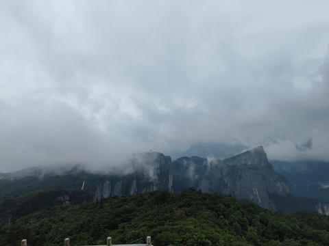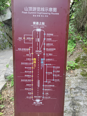 天门山山顶是一片完整的原始次生林,被美称为空中花园。山顶的游览又分为中线(中线是上天门山最高峰云梦仙顶),东线和西线。以索道上站和天门山寺为两个端点,东线和西线是刚好一个圈。西线景色最佳,我们选择先到中线,再走西线—东线的大环线。