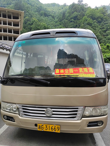 张家界中心汽车站发往武陵源汽车站的班车(张家界中心汽车站就在火车站附近步行5分钟的距离,不论是去往森林公园或是换乘去周边市县都非常方便。中心汽车站往森林公园门票站和武陵源门票站的车次都是很密的,到这两处门票站都是最早6:30发车,大约10--15分钟一班,流水发车,从中心汽车站到张家界国家森林公园标志门的班车,终点是武陵源汽车站,车程约60分钟,票价13元),班车从汽车站出来,先在市区内转圈,会经过火车站,天门山索道下站,武陵山珍馆,整个转圈大概需要10几分钟,市区到高铁站之间的路上,班车开的好慢,几乎是走走停停,在高铁站,前一趟班车直接把乘客全部移交到我乘坐的班车上,司机师傅说平时他们都是这样的,汽车站要求流水发车,10分钟左右就要一班,不能延迟,他们需要养家糊口,不可能空跑。