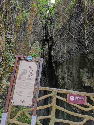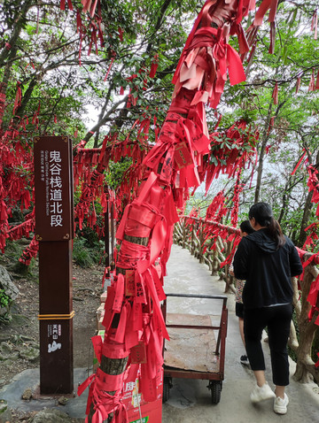鬼谷栈道悬于鬼谷洞上侧的峭壁沿线,全长1600米,平均海拔1400米,是天门山顶最刺激的路段,西线路程有一半以上都是在其之上行走的。