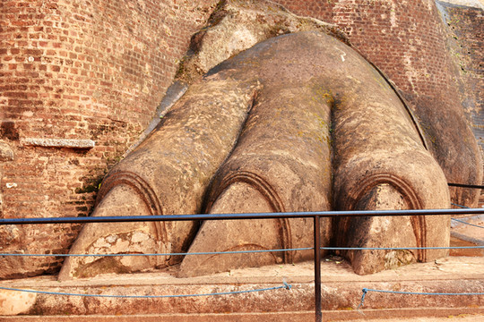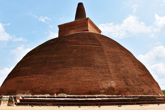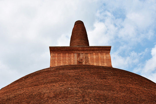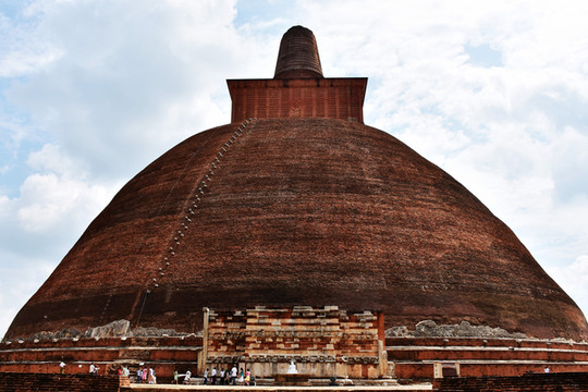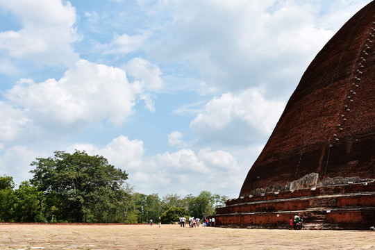 在圣菩提寺附近,有一座巨大的砖红色舍利塔,在乘tutu车游走田野间时,便可断断续续的看见这座佛塔高高的耸立在一片无垠之中,走到跟前更会被它的高度和巨大体积所震撼。这座塔锡兰语意为阿巴哈亚奇瑞舍利塔,又称无畏山舍利塔,是阿努拉德普勒最宏伟的三座佛塔之一。公元前一世纪,伐多迦摩尼·阿巴耶国王命令修建了这座佛塔,据说当时高110米,和鲁梵玛利萨亚佛塔差不多高,虽然现在只剩光秃秃的一座舍利塔,在当时只是整体寺院建筑的一部分,据记载,当时寺庙可容纳5000名僧众,中国著名的高僧法显和尚就曾经在这里学习研究过佛经,如今大约高75米。