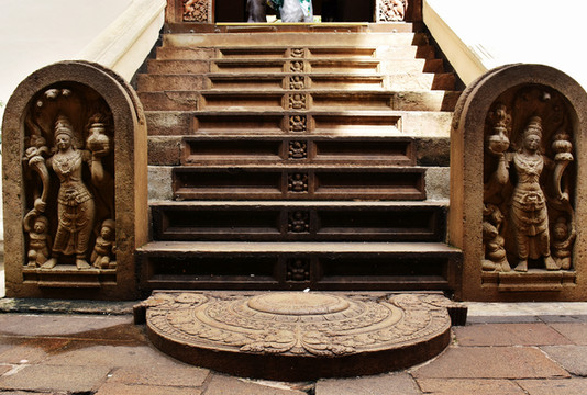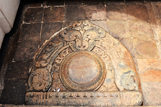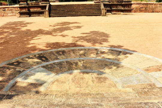 月亮石是斯里兰卡一种雕刻非常精美的建筑艺术,这种独特的石雕艺术,在重要的宫殿、寺庙或佛塔下都可以看见,一个巨大的半圆形雕刻,由一圈圈同心半圆组成,每一圈都雕刻着不同主题,象征着不同的意义,比如最外一圈是火焰,象征人类世界的欲望和贪婪;第二圈通常是大象、马、狮子和牛,从左到右互相追逐,象征生命和活力,大象代表生,马代表老,狮子代表病,牛代表死,加起来就是轮回;接下去一圈是飞鹅,代表着善于恶的界限;最后中间的半边莲花,象征纯洁和到达极乐世界;分隔动物、莲花、飞鹅的是缠裹藤蔓的浮雕饰带,代表生命的力量。整个月亮石就是象征着生命的轮回,最后走向极乐世界的过程,信徒赤脚走过月亮石,就代表了身心的净化和精神的飞跃。在月亮石后期的演变中,在选材、花纹和形状上都有很大改变,并随着印度教的传入,没有了牛的图形。在无畏山佛塔的西侧,保存着这块最精美的月亮石。