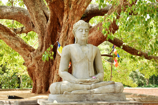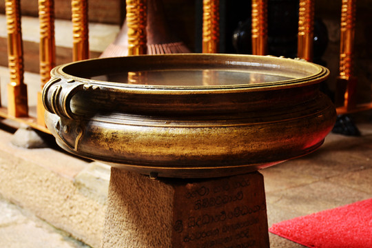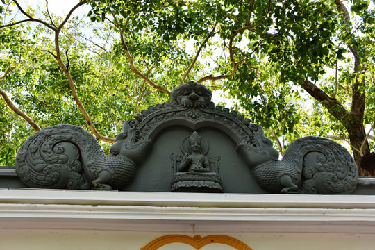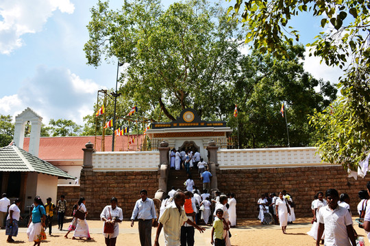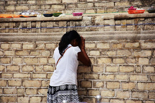 从鲁梵维利萨亚舍利塔路过黄铜殿,再往里走就是圣菩提寺。阿努拉德普勒的神圣地位,主要就来自于里面的这颗神树。公元前247年,印度阿育王的儿子摩哂陀南到斯里兰卡弘法,兰卡国王皈依佛教后向阿育王请求将菩提树移枝到斯里兰卡,于是阿育王派女儿从印度菩提伽耶,那棵见证佛陀悟道的菩提树上,取来树苗,移栽到阿努拉德普勒菩提寺的花园里。从此,阿努拉德普勒就以这课菩提树为中心向四面八方发展开去,很快成为僧伽罗王朝的政治经济文化中心。随着历史的变迁,印度那棵菩提树死了,反而又从这里移栽了一棵回去。虽然有人说阿努拉德普勒建城多久,这课菩提树就有多久,其实如今里面这棵菩提树已经更替到第六代了。但不管怎样,佛教就从那时在斯里兰卡牢牢扎根,像这棵菩提树一样不断发扬壮大,即使历经其他宗教统治者入侵依然屹立不倒。圣菩提树就像阿努拉德普勒的一缕精魂,为我们触摸圣城从远古到当下的脉络保留着一条最纯正的根系。