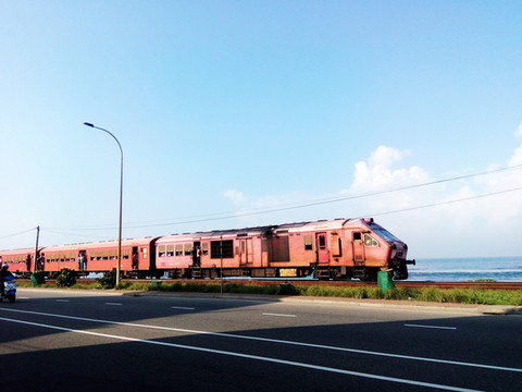 红色的火车与蓝色的海水交相辉映,在南亚的骄阳下感受不一样的风景