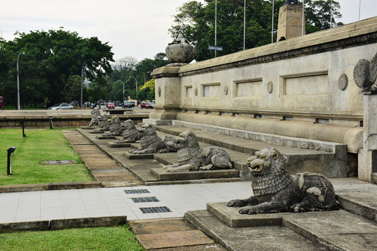 广场周围的绿色草坪映衬着独立纪念堂,四周有60尊象征僧加罗人的石狮子,每一只狮子都代表一位国王,纪念堂的北面是兰卡开国总理森约那亚克的雕像。