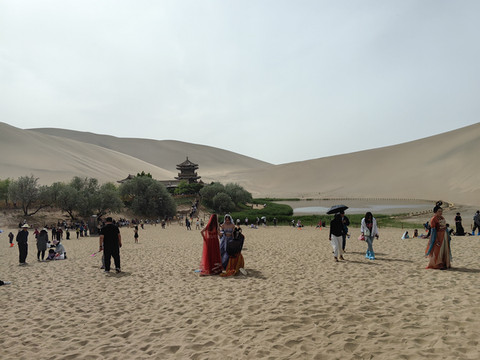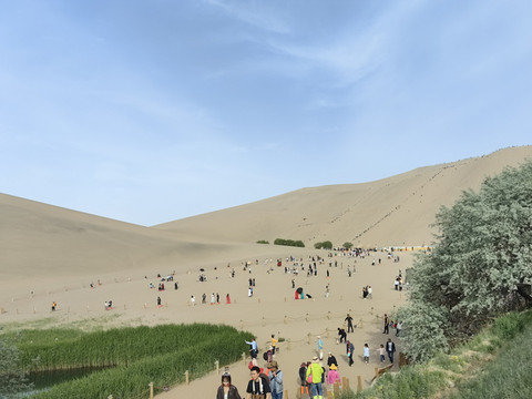 刚进入5月份,西北的中午就已经很热了。从莫高窟出来,我们直接返回酒店休息。傍晚时分,我们又来到鸣沙山-月牙泉景区。