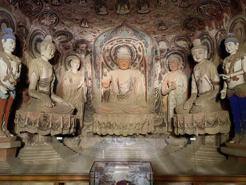 莫高窟各窟均是洞窟建筑、彩塑、绘画三位一体的综合性艺术。洞窟最大者200多平方米,最小者不足1平方米。洞窟形制主要有禅窟、中心塔柱窟、佛龛窟、佛坛窟、涅盘窟、七佛窟、大像窟等。塑绘结合的彩塑内容主要有佛、菩萨、弟子、天王、力士像等。彩塑形式有圆塑、浮塑、影塑、善业泥等。圆雕、浮雕除第96、130窟两尊大佛,第148、158两大卧佛为石胎泥塑外,其余均为木骨泥塑。佛像居中心,两侧侍立弟子、菩萨、天王、力士,少则3身,多则11身。以第96窟35.6米的弥勒坐像为最高,小则10余厘米。