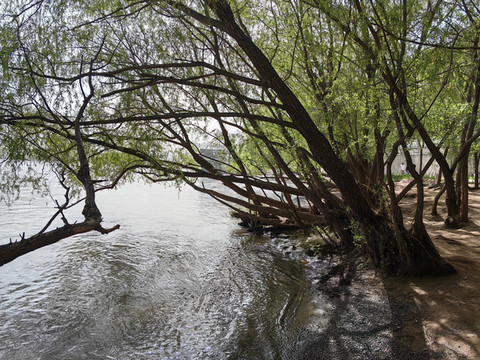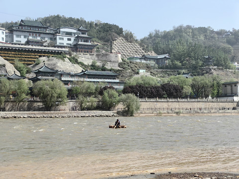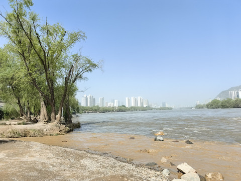 从这里可以坐船或者羊皮筏子游览黄河,我们选择沿黄河岸边步行。时值4月末,兰州市区的黄河水还是比较清澈的,沿岸有许多地方可以与黄河水近距离接触。