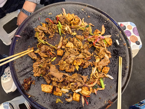 上午在黄河边跟一位当地的大姐聊天,她给我们推荐了她们本地人经常去的西站夜市。晚上,我们来到西站夜市。