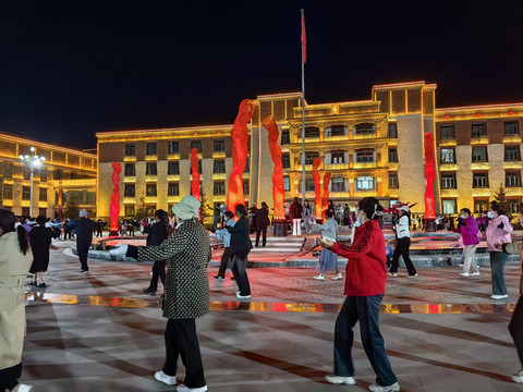 傍晚有许多市民聚集在天祝县政府门前的广场上,大家围在一起跳着欢快的锅庄舞。