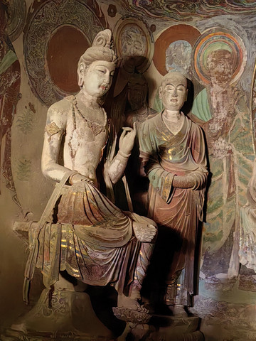不同的景区讲解员所参观的石窟线路是不同的,跟随讲解员随机参观了8个石窟,每个石窟都有精美的壁画和塑像,数量众多,形态各异。参观完九层楼,莫高窟的游览也结束了。