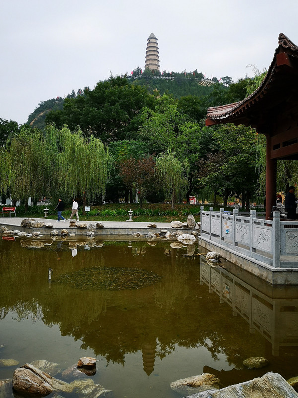 到达山顶已经是9点钟,凡是景区就是一个折腾人的地方。山顶上很多人,都是一队队旅游团,有些团队穿上红军服装,看上去怪怪的,其实宝塔并没有什么特别,我们穿插在人群中,找空袭拍照,绕宝塔周边走一圈,看看延安的新貌。下山后到对面的柳园看看,也是近年新建的人文景观,不过那亭台旁的一小池水倒映出了宝塔的雄姿却很美。回到酒店计划今天离开延安,再去杨家岭枣园参观一下昔日去过的革命旧址,就直奔雨岔大峡谷了,只有76公里的路程。去杨家岭的途中路过杨家坪,距离酒店才1.6公里。王家坪位于延安城西北方向,隔延河与城相望,依山傍水,环境优美。党中央进驻延安后,军委和总部机关在这里领导根据地军民坚持了八年抗战。日寇投降后,又与国民党的全面进攻较量。1947年3月18日,毛泽东、周恩来率部从这里撤离,转战陕北。这里是中共夺取政权的军事中心,里面有彭德怀林彪等人的旧居,但是却没有开放,也许是疫情的缘故吧,在这里我没有留下串联时来过的印象,如今只是在想,从抗战到内战,中国战争史上在这里产生的将军其名永垂不朽。下一站是杨家岭。