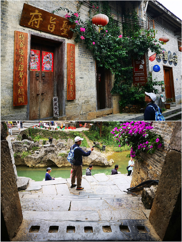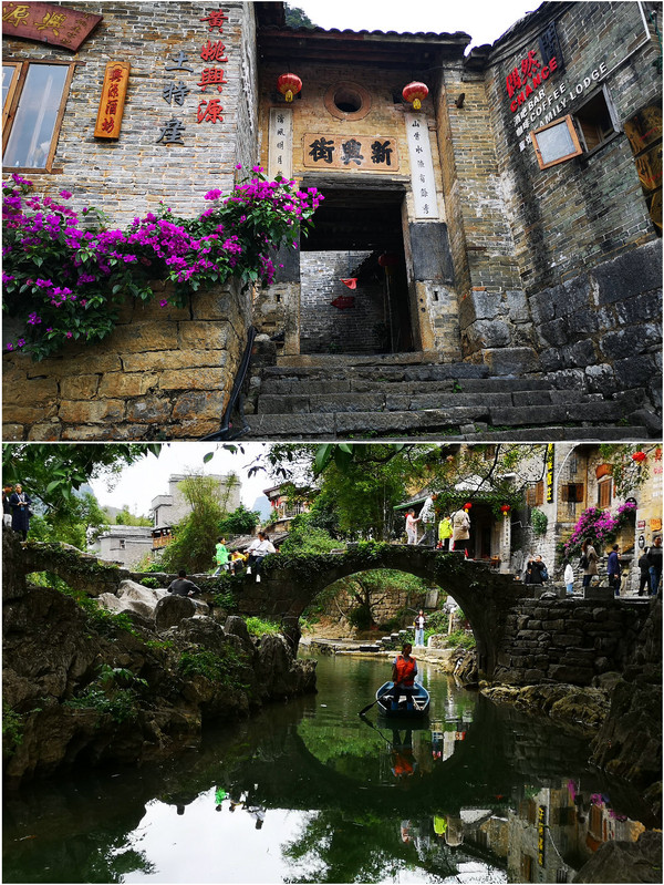 黄姚古镇位于广西贺州昭平县东北部,方圆3.6公里,属喀斯特地貌。发祥于宋朝年间,有着近1000年历史。自然景观有八大景二十四小景;保存有寺观庙祠20多座,亭台楼阁10多处,多为明清建筑。著名的景点有广西省工委旧址,古戏台,安乐寺等。古镇里的门楼、古戏台、古街、古井、民居、宗祠、庙宇、桥、亭、匾等有形建筑遗产,特别是作为整体出现的古镇聚落环境是其特色。古镇明清古建筑保存有300多幢,面积达1.6万平方米,完整保存8条石板街,全部用青石板砌成,全长10多公里。还有亭台楼阁10多处,寺观庙祠20多座,特色桥梁11座,楹联匾额上百副。古镇建筑具有很高的艺术审美价值,其设计建造匠心独运,从建筑学上说也是一笔宝贵的遗产。小镇中有多小河,其中一条干渠为瑶河从村中穿过,河岸的房子高低错落,村民在自家房脚河边石板上挥棒捶打洗衣,小巷中开始摆摊买早餐以及特色食品,叶生便做下来吃粥,我说:早上的粥还没吃饱?其实他是被这小食摊迷恋,我独自去游览,在一个美丽的河湾等他过来。一座石拱桥在溪水倒映下变成一个圆,桥下有清理垃圾的工人划小船从桥下过,游人开始多起来,因为今天去罗定很轻松,不着急可以慢慢玩。也没有路线图跟着人群往前走。真是值得看,地面已经被年代久远的脚步磨平,光滑如镜。居民们平和微笑的眼神欢迎游客们能给他们带来的收入,希望游客停下来买点什么。街巷门楼很有特色,不像江浙一带的古镇没有山和茂密的古树和竹林。我们穿梭在河边古老的街巷,被那古老的建筑和具有现在情趣的布置感动着,欣赏着。门口的花棚和商品搭配的那么融合,即使不买也会驻足观赏一会儿。有时会转到河边,有时又进入古老街道,这里面没有大面积的广场,只要有一点点空地就会是一小片热闹的商业集散地。好吃的好玩的应有尽有。在深巷里我被一个卖粉条的姑娘那友好的眼神打动,便买了两包红薯粉和米粉。这里的一切是那么的和谐,让人感动,让人舍不得离去。