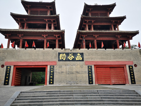 函谷关,西据高原,东临绝涧,南接秦岭,北塞黄河,是中国历史上建置最早的雄关要塞之一。因紧靠黄河岸边,关在谷中,深险如函,故称函谷关。这里曾是战马嘶鸣的古战场,与"一夫当关,万夫莫开"的剑门关都是重要关口。这里又是我国古代思想家、哲学家老子著述五千言《道德经》的地方,道家文化的发祥地,千百年来,众多海内外道家、道教人士都到这里朝圣祭祖,是古代西去长安、东达洛阳的通衢咽喉,河南文化和秦晋文化的交汇地;是千百年烽烟际会、兵家必争的战略要塞,紫气东来、鸡鸣函关等历史故事与传说的发轫地。在漫漫历史长河中,这里以名人(老子)、名著(《道德经》)、名关(函谷关)留芳青史,声播海内外。主要景点有太初宫、道圣宫、道家养生园、藏经楼、瞻紫楼、鸡鸣台、碑林、蜡像馆、博物馆、关楼、函关古道等20余处 。叶生边走边说这里曾经的故事,正好我们刚刚看完楚汉相争的电视剧,对这里的历史也多少知道一点,漫漫历史长河,战争厮杀领土相争,秦始皇居关一统中华,失关成就汉朝,烽烟炽烈,哀魂遍野。如今游人荡漾其间,观地貌模型读史书记载,又怎能体察千年战时之残酷?